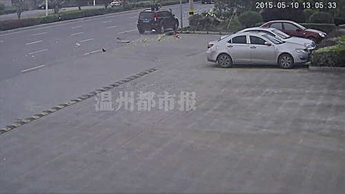 附近的两个监控同时捕捉到了这一幕:事发路段往来车辆较少,老人在非机动车道上骑三轮车,速度很慢。金女士驾驶的黑色越野车同向行驶,不知为何,越野车越开越往右斜,突然就撞上了老人的三轮车,于是就出现了开头的一幕。