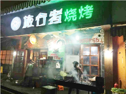 5月12日20时,记者来到旅行者烧烤店,服务员正在店门口的烧烤架上烤羊肉串,烟味呛人。烧烤店门口的路面黑乎乎油腻腻的,稍有不慎就容易摔跤。走进该店厨房,油烟味更是刺鼻。