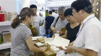 纸传文化的文化创意笔记本引人注目。一位老伯看后很喜欢,现场掏钱买下一本千字文笔记本。苏亦锋 摄
