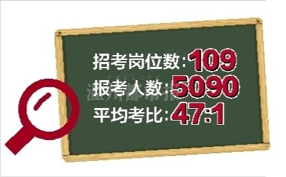 温州网讯 2015年温州市市级事业单位公开招聘工作人员考试今天开考。经市人力资源和社会保障局确定,共有5090名考生成功报考2015年温州市市级事业单位公开招聘,角逐109个岗位。此次招考平均考比约47:1,高于今年省公务员招考中我市党政机关招聘岗位的平均考比25.09:1。其中,最热门的岗位考比达到417:1,最低考比为3:1。