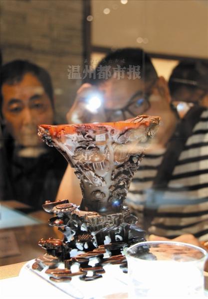 这只犀角杯据称价值600多万元,是该展馆中最贵重的文玩之一。据介绍,犀角杯为晚明作品,不但雕工精致,杯子尺寸也较大,而且杯身上还留有“文苑”两字。行内人士透露,尺寸这么大的犀角杯在全国已属罕见,而镌有文字的更为难得。