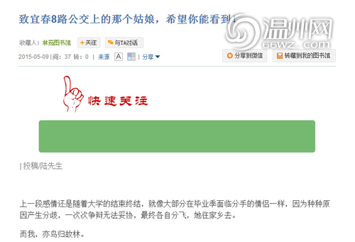 通过网络搜索,记者发现,早在5月初网络上就已流传了一个“宜春”版本,标题为《致宜春8路公交上的那个姑娘,希望你能看到!》。