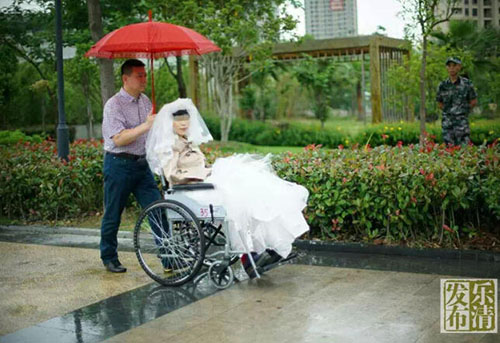 新娘坐在轮椅上,努力露出微笑,虽然脸色苍白,但亲友们公认这是他们见过的最美的新娘;新郎一直流着眼泪,流露出与婚礼气氛不协调的哀伤,但亲友们认为这是他们心目中最幸福的新郎。昨天,市区中心公园,40多名志愿者在一场露天婚礼的现场,为一对特殊的新人送上美好的祝愿。