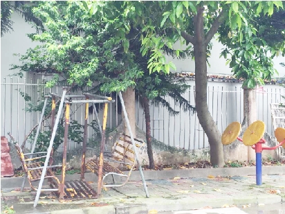 市中心公园里为数不多的儿童娱乐设施都有不同程度的损坏。其中一个蓝色海豚游乐座椅乍看上去像没问题,但是海豚和弹簧处缺少螺丝,只要一有小孩坐上去,海豚就会往后仰,上面的孩子就会摔下来。