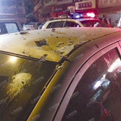 昨天凌晨零时许,双乐住宅区一家烧烤店老板吴先生正在招揽生意,突然听见“砰”的一声巨响——原来一辆停在对面的轿车车顶,被高空抛下的垃圾砸出一个碗口大的凹坑。吴先生和食客金先生等人一起报了警。