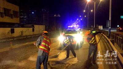 石子散地造成辆追尾 公路人员连夜及时处置保通畅
