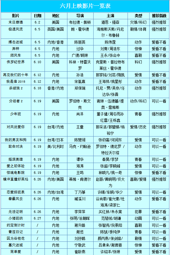 六月上映影片一览