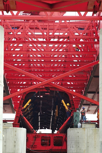 市域铁路S1线SG14标段过江大桥上的双幅上承式移动模架基本安装完成,该设备可一次浇筑50米跨度的桥梁。陈翔摄