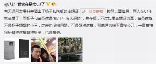 5月28日有网友爆料称其实杨子和陶虹早在2004年就离了婚,同时还晒出了陶虹和杨子的离婚证,爆料账号“八卦_我实在是太CJ了”在微博写道“有天涯网友爆料并晒出了杨子和陶虹的离婚证,按照上面信息,两人在04年就离婚了,而杨子和黄圣依是“05年年底认识的”,先存疑,不过如果离婚证为真,黄圣依就不是杨子婚姻的小三,恋爱也没啥问题。可是既然这样,那他俩为啥不直接公开,一直神神秘秘各种遮掩各种折腾,也是神奇。”在网友晒出的离婚证上,能清楚的看到杨子妻子陶虹的照片和姓名,登记日期上写着2004年3月2日,在离婚证的下方写着陶虹和杨子的讯息。就此,记者致电杨子,他回应:“离婚多年属实,没公开是怕给孩子造成心理阴影,想给孩子一个快乐的童年。”