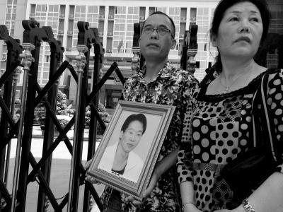 林家人手捧林立峰的遗像,站在法院外神情黯然。