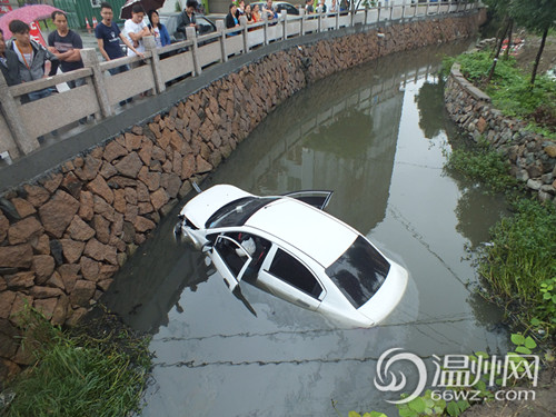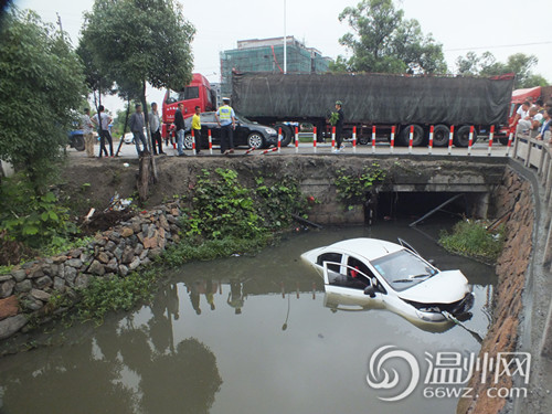 下雨天车速过快避让不及 平阳一轿车冲进了河里
