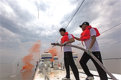 船员正在消防演习中灭火。 戴海智 摄