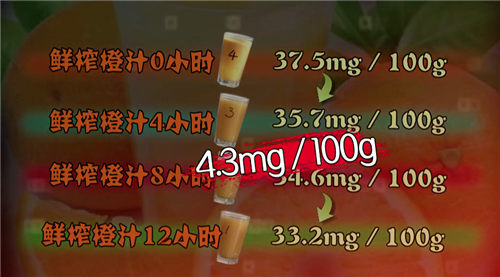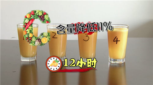 中国农业大学食品科学与营养工程学院教授、教育部果蔬加工工程技术研究中心副主任吴继红解释称:“鲜榨的果汁,在榨的过程中有很多氧气就进去了,在放置的过程中又是一个开放的环境,所以有氧的环境下,果汁的维生素C损失的就会很高。维生素C除了对氧气敏感之外,对光和热也敏感。”