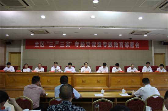 王军要求,要以严实的作风抓好“三严三实”专题教育,突出问题导向,坚持以上率下,确保取得实实在在的成效。要加强领导、精心组织,加强宣传引导,营造浓厚氛围;要把握关键、狠抓落实,要组织好专题学习研讨,深化“四风”整治,深入开展正风肃纪;要以上率下、示范引领,区级领导带头学习提高、带头查摆问题;要统筹兼顾、注重实效,把开展专题教育与区委区政府的各项中心工作结合起来。