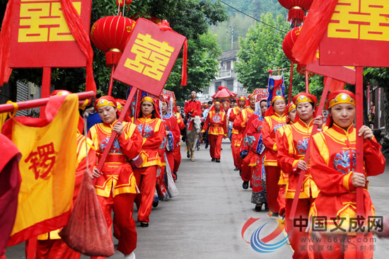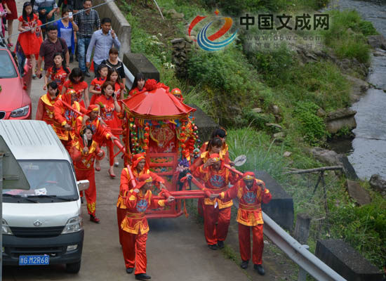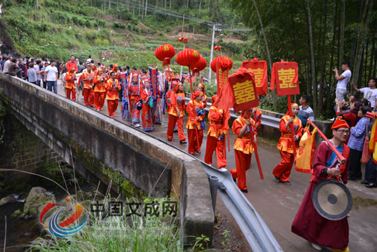 颠完轿,随着三声炮响,浩浩荡荡的迎亲队伍便前往新郎家。古典的婚礼与空前的盛况,让每个在场的人都热血沸腾。由于是传统的婚礼,沿途看热闹的人很多,从玉壶前往桃坑村的路上,花轿被多次拦截。