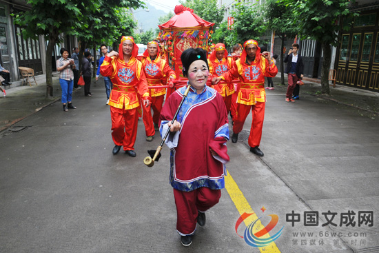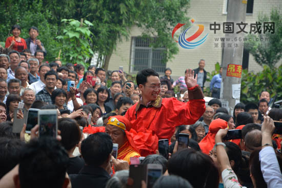队伍到达玉壶镇时是8点10分,传统的仪式,古色古香的迎亲队伍,手执烟杆滑稽的媒婆顿时让整个小镇沸腾起来,到处车水马龙,人山人海,新娘家的路口更是空前的热闹,纵横交错的路被围堵得水泄不通,百年侨乡迎来了难得一见的万人空巷的时刻。