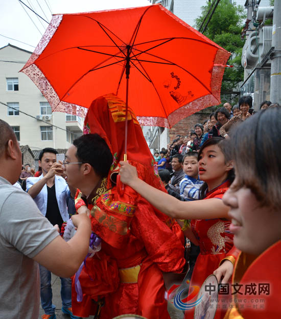 上午9时,身着红装,蒙着盖头的新娘被新郎背下楼。出了门,伴娘便撑起一把红伞护着新娘。红盖头与撑红伞都是传统婚礼上必不可少的用品。旧时出嫁当天新娘子通常会以一条边长为三尺的正方形红围巾蒙在头上,这红色的围巾称为“盖巾”,俗称盖头。对于盖头这一婚俗的说法有两种:一种说法是古时候新娘蒙红盖头,是为了遮羞;另一种说法是源自古代的“掠夺婚”之说,意为新娘子蒙上盖头后就永远找不到回去的路了,犹如“嫁出去的女儿泼出去的水”。撑红伞,则为“开枝散叶”,寓为吉祥。
