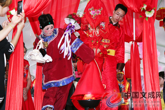 到了新郎家,新娘子在吹吹打打、鞭炮齐鸣中下了轿。旧时,新娘下轿后在进入夫家后要跨马鞍与火盆。马鞍的“鞍”与“安”同音,取其“平安”长久之意。多放于洞房的门槛上,表示新娘跨马鞍,一世保平安。当新娘前脚迈入门槛,后脚抬起还没有落下的时候,这时由上有父母、下有子女的全人把马鞍抽掉,正好符合了“烈女不嫁二夫,好马不配双鞍”的意思。跨火盆,寓意婚后的日子红红火火。