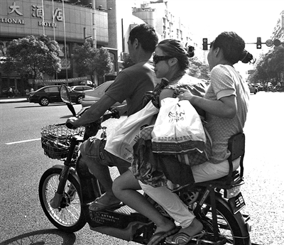 孙石说,违规驶入机动车道、不按红绿灯指示行驶、随意穿插乱变道、车速过快、违法带人、违法加装遮阳篷等行为,是电动车交通违法中比较普遍的。据统计,今年截至5月20日,交警三大队民警查获二轮电动车违法行为2113起,其中不按照交通信号规定通行(就是人们通常说的“闯红灯”)的1230起,违反规定载人的563起,未在非机动车道内行驶的320起。