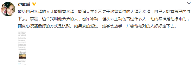 6月3日,伊能静再发文挺好友李晨,更称李晨从未主动伤害过什么人,他的幸福是他自己挣来的。