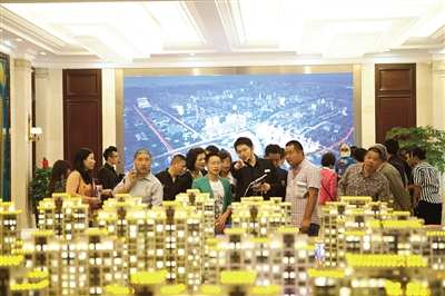 购房者正在参观市区某楼盘售楼处。资料图片