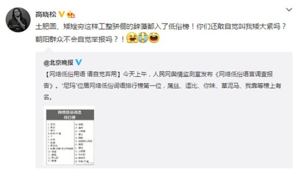 高晓松:我不要你接机!我不要比我高比我小比我松的人!我要比我矮比我大比我紧,我要有鹅立鸡群的快感!即刻组织250名矮大紧内牛满面接机团,条件矮于178厘米、重于80千克、老于45、脸大于0.5平米!报名请附免冠赤脚不愉快自拍照