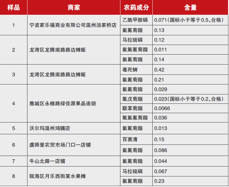 经检测,8份样品均含有农药残留 经过工作人员初步检测,8份样品中全部都检测出含有一种以上的农药成分,其中氯氰菊酯农药残留8份都有,残留量从0.013mg/kg~0.23mg/kg不等(如表)。 (氯氰菊酯等检测项目,国标中没有说明农药最大残留限量)