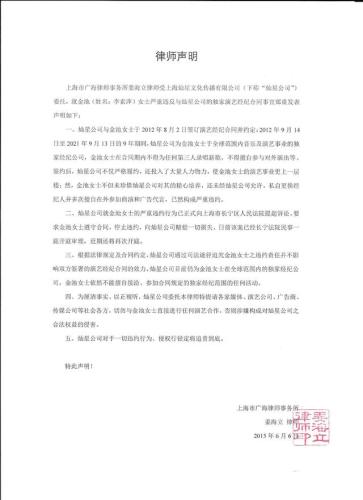上海市广海律师事务所姜海立律师受上海灿星文化传播有限公司(下称“灿星公司”)委托,就金池(姓名:李素萍)女士严重违反与灿星公司的独家演艺经纪合同事宜郑重发表声明如下: