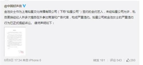 6月9日17点34分,《中国好声音》官微发布声明,称金池女士作为上海灿星文化传播有限公司(下文称“灿星公司”)签约的全约艺人,未经灿星公司允许,私自更换经纪人并多次擅自在外参加商演和广告代言,构成严重违约。要求金池停止违约,向灿星公司赔偿一切损失。金池现在仍和灿星是合作关系,在合同未到期的情况下,金池依然不能擅自接洽、参加合同规定的独家经纪范围外的任何活动。灿星公司委托并特提请各家媒体、演艺公司、广告商、传媒公司等社会各方,切勿与金池女士直接进行任何演艺合作,否则涉嫌构成对灿星公司之合法权益的侵害。