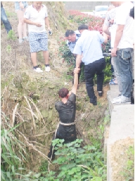 没有路通往山崖下,四周都是杂草。在群众的帮助下,包德贤、胡志华两人拉着尼龙绳索从山崖边慢慢下去。山崖边坡杂草丛生,包德贤、胡志华俯下身子爬着进去,两人的手臂都被锋利的杂草割破流血,他们全然不顾疼痛,接近伤者。