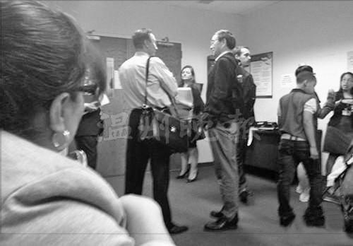 美国当地时间6月9日,杨秀珠的代理律师柯自明(中左)在美国纽约移民法庭等待开庭。(环球网/新华网资料图)