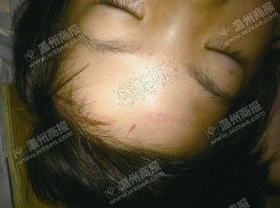 吴女士称丫丫额头有被指甲划伤的痕迹。受访者供图