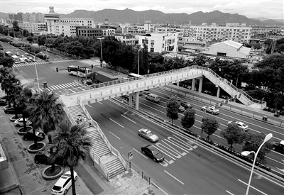 昨天,在机场大道,市民从人行天桥通过。 苏巧将 林佰露 摄