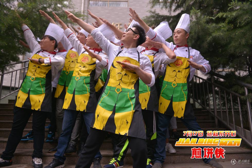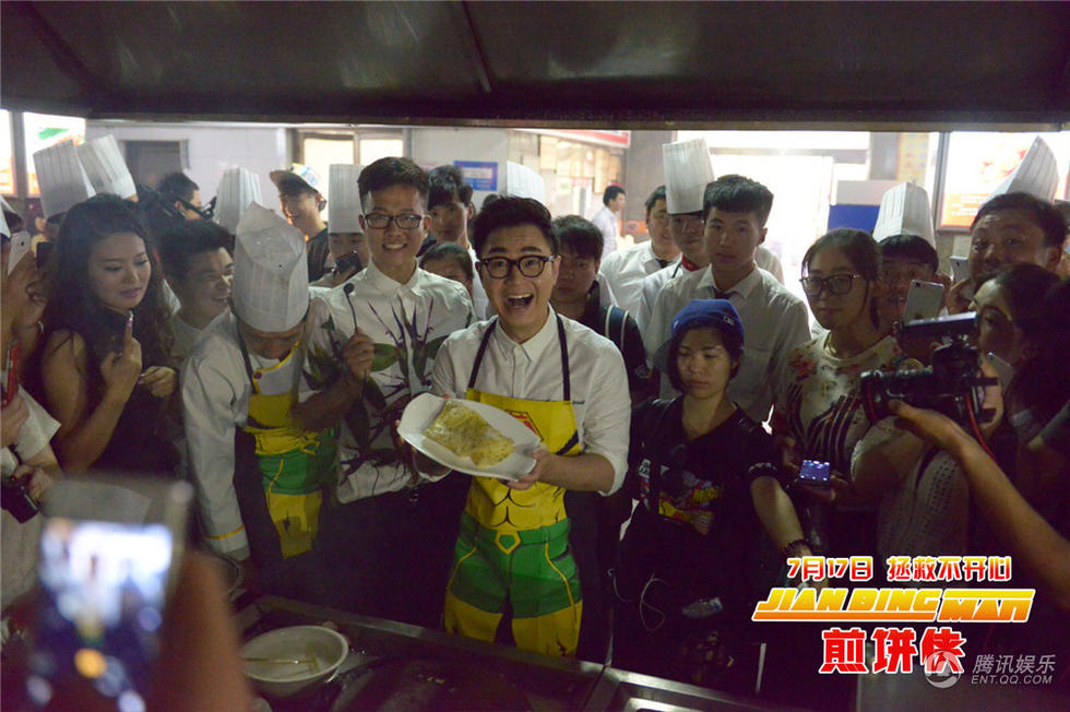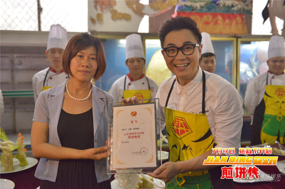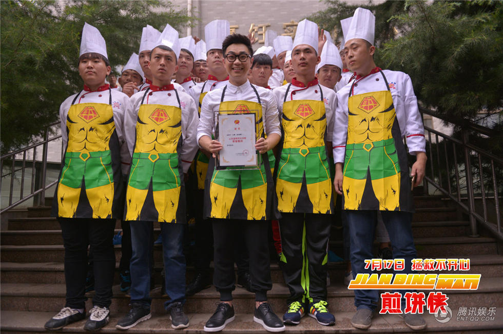 首秀厨艺大鹏获颁蓝翔“荣誉教师”在本次见面会中,大鹏还为学生慷慨放送精心准备的签名照及签名书,引起学生间不小的骚动。其后也是好戏不断,在与美容美发专业学生合影的环节中,大鹏更是成功引起了新一轮的疯狂尖叫,也让现场进入了一片放肆欢乐的气氛。大鹏笑称:“我很感谢这个专业,因为没有你们我都没法出门。”之后,活动启动了当天最重磅的环节——“若问煎饼哪家强,中国山东找蓝翔”!在蓝翔技校的烹饪车间内,大鹏与穿戴同款《煎饼侠》样式围裙的近百名学子一同摊起了煎饼,场面色味俱佳,浓郁的煎饼香气充斥了整个车间,不禁让在场所有人都连连做出吞口水状。而大鹏作为“煎饼侠”也的确当之无愧,摊饼、刷酱、撒葱花一气呵成,专业十足,连校方领导都已深深地被大鹏摊煎饼技术所折服,果断将“蓝翔烹饪学校荣誉教师”证书颁发给了大鹏,同时还赠送校方特别订制的“煎饼侠”雕刻。而大鹏也是欣喜若狂,笑称“就算以后电影不好做了,还能来教人摊煎饼!”