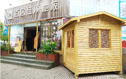 张先生说的这座“凉亭”,位于乐成街道乐湖路与西金路的交叉处,紧靠着一家名为“百居佳丽地板”的建材店。这座“凉亭”为木质结构,占用了部分人行道,门窗紧闭还上了锁。除此之外,“凉亭”外还堆放着一些材料,同样侵占了人行道。