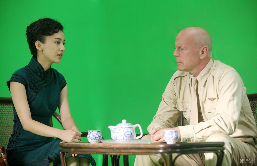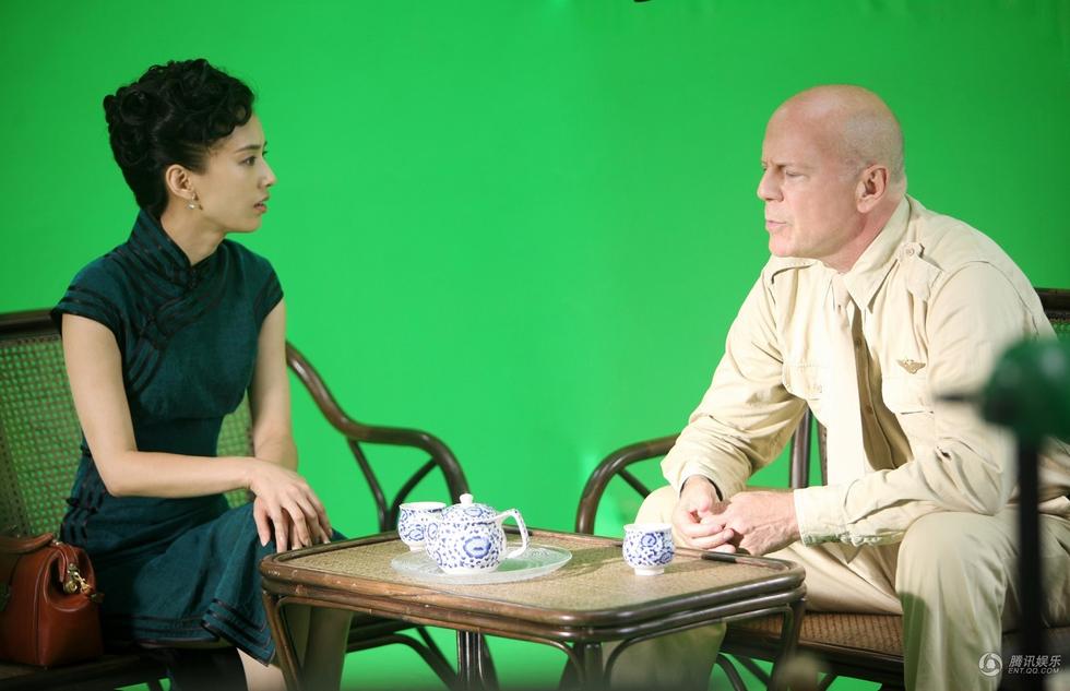 昨天,黄圣依低调赶赴《大轰炸》剧组,与布鲁斯·威利斯搭档了首场对手戏。该场戏份中,高盘云髻的黄圣依一身青色旗袍,与布鲁斯·威利斯共同探讨战争局势。