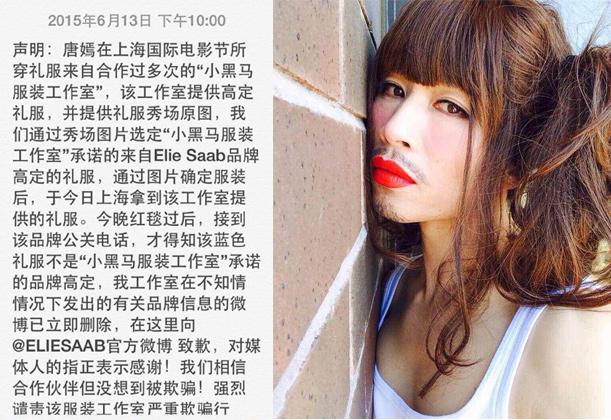 现场的她是美的,也是高级的。可是这种高级感没有维持多久,就被网络撕得粉碎。在“唐嫣工作室”发微博点名服装品牌是Elie Saab高定之后,就开始有网友认出这是假货。随后该品牌公关也出面澄清服装是山寨。之后,唐嫣工作室默默删掉微博,并发文致歉,表示全部都怪罪于帮他们借服装的“小黑马服装工作室”。对此,我只想说一句话:艾玛,听到这个工作室的名字嚎,就有一种想说东北话的赶脚。
