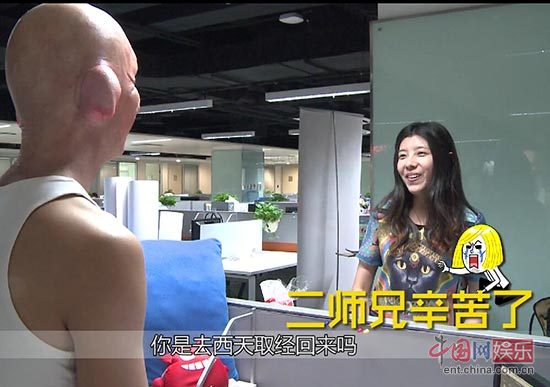 据悉,两名野兽人戴着超级夸张的猪八戒和蜥蜴面具,突然出现在鹅厂,惊吓程度不止五颗星。不过游走在娱乐前沿的企鹅人一会儿就适应过来,纷纷拿出手机拍照留念,并上前调侃猪八戒面具男:“你是刚从西天取经回来的吗”。