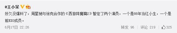 腾讯娱乐讯6月17日晚,有自称知名娱乐评论人的网友爆料称,“周星驰与徐克合作的《西游降魔篇2》暂定了两个演员,一个是88年当红小生,一个是前EXO成员”。网友纷纷留言猜测,88年出身、与徐克合作过《狄仁杰之神都龙王》、《智取威虎山》的林更新,以及EXO前人气成员吴亦凡可能性最大。腾讯娱乐就此向投资方阿里影业宣传负责人陈先生求证,对方表示“不予置评”。