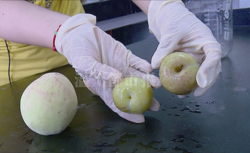 “水果扮靓方法”真的存在吗?前天,记者购买了荔枝等时令水果,来到温州大学化学与材料工程学院实验室进行实验,告诉你真相。