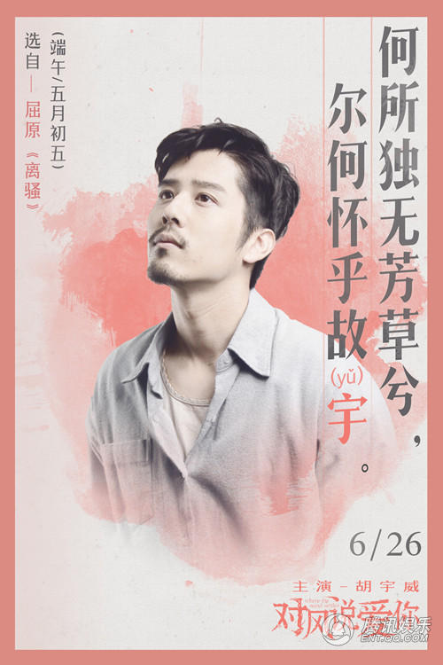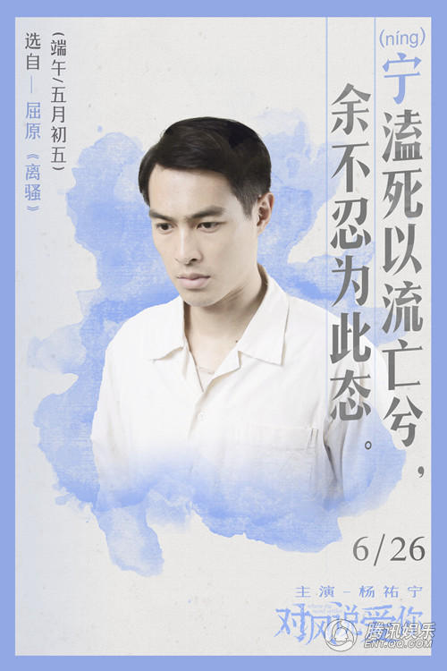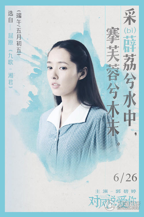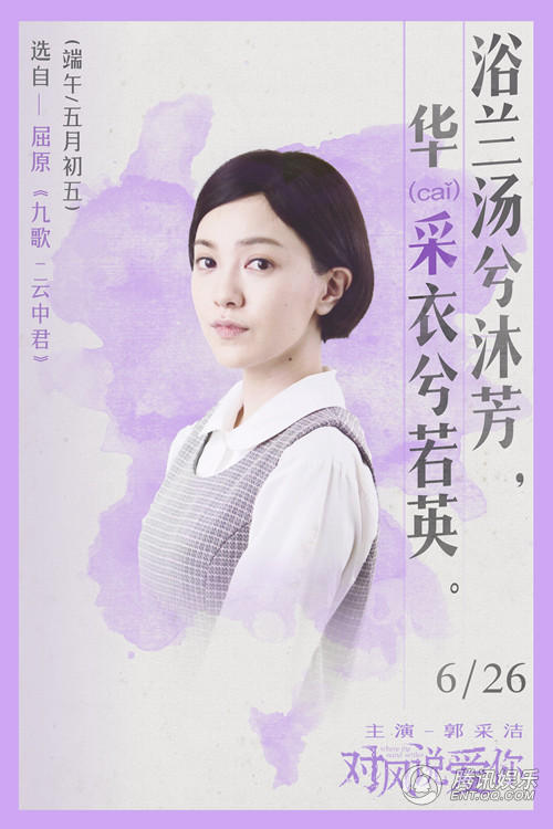 4张海报中的文字均选自于屈原的传世之作《离骚》《九歌》。水墨在纸上晕染摊开与屈原的诗句相融合,让人感到决然与悲壮。而巧妙的是,每款海报中的诗句“宁溘死以流亡兮;华采衣兮若英;采薜荔兮水中;尔何怀乎故宇”都有主演杨祐宁、郭采洁、郭碧婷、胡宇威名字的字音。同时海报中的文字也在宣扬着屈原的精神:光明、正义、不屈不挠以及高尚的风骨,与影片中小人物们对于爱与生活的追求有着很强的相似之处。