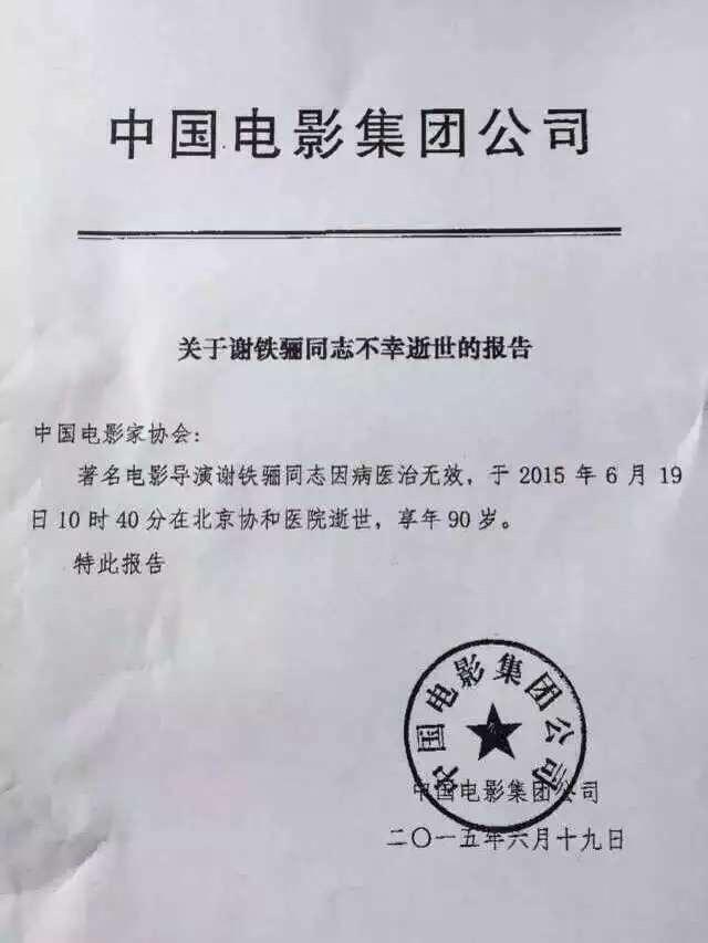 腾讯娱乐讯6月19日,中国电影集团公司发布公告称,“国内知名导演谢铁骊同志因病医治无效,于6月19日10时40分在北京协和医院逝世,享年90岁。随后六小龄童也在微博上证实了这一消息,而曾与其合作过的演员沙溢、邢岷山等纷纷发布微博表示次沉痛的悼念。