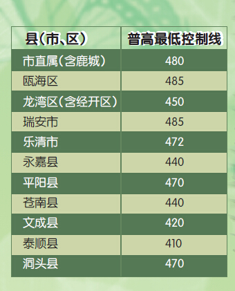 全市各普通高中不得招收生源地普高最低控制线以下的考生,否则不能建立普高电子学籍。例如:龙湾区(含经开区)某民办普通高中招收本区域考生成绩不得低于450分;该校若到永嘉县招生,可招收永嘉县今年普高最低控制线上的(含440分)考生;该校若到瓯海区招生,只能招收瓯海区今年普高最低控制线上的(含485分)考生。