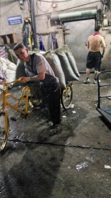 刚从冰库中走出的樊师傅,鼻尖上还挂着清涕,棉衣摸起来还有些发凉。樊师傅说,他做碎冰工已两年多了。现在天气炎热,冰库内外温差很大,因此大家都是上半身内穿短袖外套棉衣,下半身穿普通长裤,方便工作。开工前,樊师傅还要拿一个编织袋在自己膝盖处缠绕好几圈,把一部分大腿和小腿还有雨靴全都包裹起来。这样做一方面可以保护膝盖不受寒,另一方面可以防止碎冰时,有冰块顺着大腿掉入雨靴。