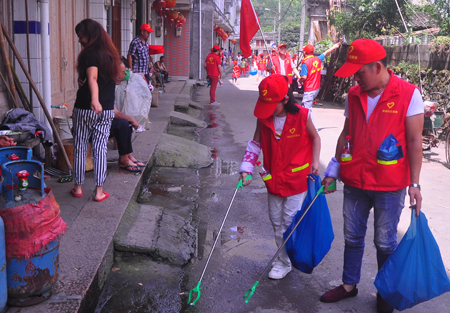 在活动现场,众多亲子家庭身披红马甲,顶着炽烈的太阳,沿着鲤溪新街清扫垃圾和堆放在房前房后的杂物。不到一个小时,整条街路就焕然一新。在县电视台工作、担任基金会理事长的李永斌原本还在云南出差,前天接到家乡环保志愿服务队开展活动的电话,二话不说就提前返程。他说,既然大家推选他作为理事长了,就要以身作则,不能拖后退。一位嫁在永嘉的安徽女子郝萌萌,因为闺蜜是鲤溪村人,也在周末带着丈夫和孩子,自告奋勇前来参加活动。小小志愿者吴加昊是郝萌萌的儿子,也是《温州晚报》的小记者,他兴致勃勃地跟“五水共治”宣讲团的叔叔伯伯一起走街串巷开展“家访式”宣讲,传递着点点滴滴的环保知识。许多乡邻看到这幕情景,都自觉地加入行动的队伍中。已经离任10多年的村委会原主任李永珍赶忙拿出刚做的麦饼,来慰劳志愿者。他说,这种行动有着很大的感染力,连这么小的孩子参加清理卫生,我们实在是很感动。一些乡亲也表示,以后要注意自己的行为,不再乱丢垃圾了。