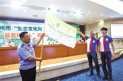 骑行者代表将环保旗帜传递给市环保局工作人员。