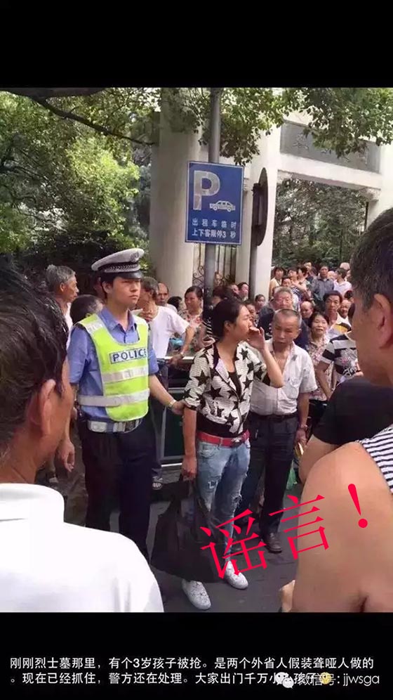 1日,台州市椒江区烈士山有人“抢小孩”的消息在朋友圈流传开来:刚刚烈士墓那里,有个3岁孩子被抢,是两个外省人假装聋哑人做的,现在已经被抓,警方还在处理,大家出门千万小心孩子。