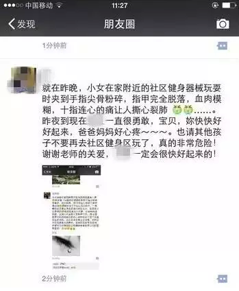 “就在昨晚,女儿在家附近的社区健身器械上玩耍时夹到手指,指尖骨粉碎,指甲完全脱落,血肉模糊。社区健身器材太危险,请家长们千万不要带小孩在那里玩耍了。”这是前两天且且妈妈在朋友圈中发出的呼吁。