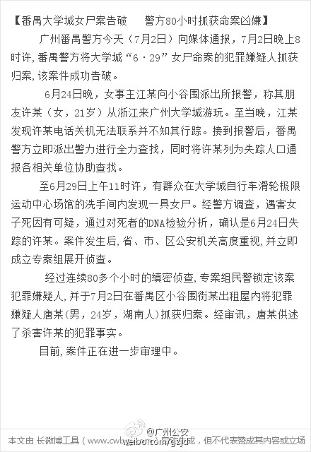 据广州市公安局官方微博消息,7月2日晚上8时许,番禺警方将大学城“6•29”女尸命案的犯罪嫌疑人唐某抓获归案,该案件成功告破。
