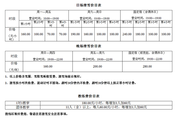 如果你不会滑雪,也不必担心,这里有技术精湛的滑雪教练,你可以请一位滑雪教练来对你进行指导。其中1对1教学,费用为180元/小时,每增加1人加60元;团体教学,11人(含)以上,每人60.00元/小时,每增加1人加60元